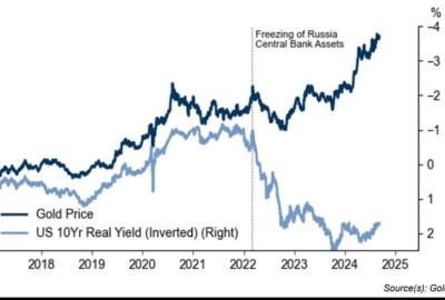 #الذهب يتصدر العالم 🌎 بدأ العائد الحقيقي للذهب وعائد السندات الأميركية لأجل 10 سنوات في عام 2022، عندما تم تجميد أصول البنك المركزي الروسي. منذ ذلك التاريخ، قامت بعض أكبر البنوك المركزية في العالم بالتخلص من سندات الخزانة الأمريكية أثناء تجميع الذهب.