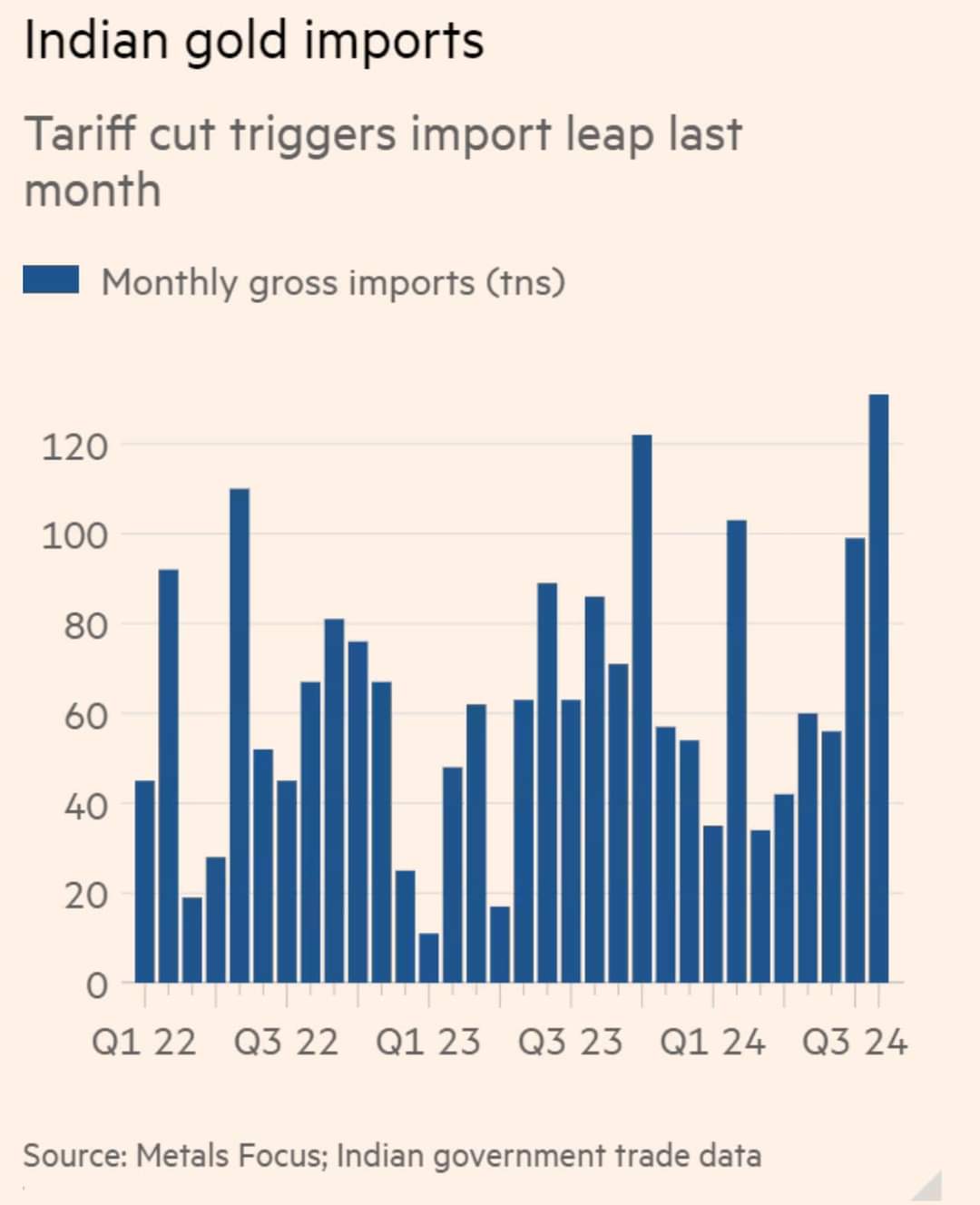 لماذا؟ وخفضت الحكومة رسوم الاستيراد على الذهب بنسبة 9% في نهاية يوليو/تموز، مما أدى إلى تجدد الارتفاع في الطلب. وقال فيليب نيومان، المدير الإداري لشركة ميتالز فوكس في لندن: "إن تأثير خفض الرسوم الجمركية كان غير مسبوق، كان لا يصدق". "لقد جلبت المستهلكين حقًا."